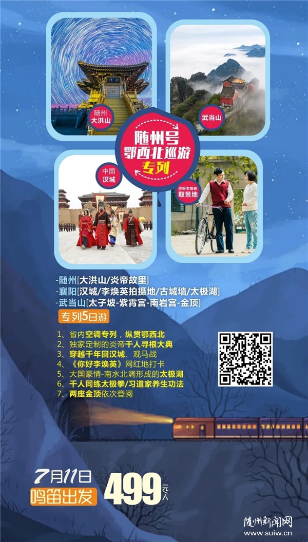 您有沒有想過,坐上一輛舒適的空調(diào)專列,在盛夏酷暑之際,悠然悠然地行駛在鄂西北廣袤的土地上,與山川對話,聽江河呢喃,看盛世繁華、美景成畫,讀人文自然、享生命之傳奇美好,穿越千年、夢回大漢…… 那么來了,由湖北峽州國旅策劃組織的我省首發(fā)“隨州號”鄂西北巡游專列將于7月11日鳴笛出發(fā),一線串連隨州、襄陽、武當(dāng)山知名景點(diǎn),精心打造屬于這個(gè)夏季非同一般的旅行體驗(yàn),讓您在綠水青山間,感受“自到仙山不知老,凡間喚作幾千年”的愜意與清涼。 隨州、襄陽、武當(dāng)山5日游搶先看 行程亮點(diǎn) 旅行專家首推景點(diǎn),行程輕松不勞累!留夠充足游覽時(shí)間! ★ 特別安排省內(nèi)空調(diào)專列,行程舒適安全有保障。 ★ 獨(dú)家定制炎帝千人尋根大典,追尋炎帝始祖的前世今生 ★ 重溫革命先烈崢嶸歲月--大洪山革命紀(jì)念館 ★ 金戈鐵馬聞?wù)鞴,只爭朝夕啟新程,觀馬戰(zhàn),穿越千年回漢城。 ★ 襄陽網(wǎng)紅景點(diǎn)《你好,李煥英》網(wǎng)紅打卡地 ★ 探尋大國豪情——南水北調(diào)形成的太極湖 ★ 游覽世界文化遺產(chǎn)【武當(dāng)山】,體驗(yàn)千人同練太極拳、習(xí)道家養(yǎng)生功法。 行程安排 第一天 出發(fā)地—隨州-大洪山 用餐:晚 住宿:隨州 。ㄏ虒08:20發(fā)車/武昌 10:00 發(fā)車/孝感 10:40發(fā)車/隨州 12:26 抵達(dá)) 歡迎來到炎帝故里--隨州! 客人乘專列赴炎帝故里隨州—隨州古稱"漢東之國",以"古、奇、美、新"而著稱,為全國歷史文化名城。被稱為炎帝故里,編鐘古樂之鄉(xiāng),現(xiàn)已成為海內(nèi)外炎黃子孫尋根問祖的圣地。 【大洪山風(fēng)景區(qū)】大洪山風(fēng)景區(qū)又名綠林山,西漢末年的農(nóng)民起義——綠林起義就是發(fā)生在這里。1988年建立了隨州大洪山名勝風(fēng)景區(qū)。景區(qū)方圓三百三十多平方公里,橫臥江漢, 蜿蜒荊襄,氣勢磅礴,風(fēng)光秀麗,具有"一山分四季,十里不同溫"的氣候特點(diǎn)。 【大洪山革命紀(jì)念館】大洪山的革命史,始自辛亥革命,賀龍、徐向前、陶鑄、李先念等老一輩革命家,為中國民族獨(dú)立和解放,曾戰(zhàn)斗在大洪山。 【慢游白龍池】 山水相依的白龍池,這里地勢開闊,群山環(huán)抱,植被繁茂。湖光山色,相映成趣,被譽(yù)為"鄂中瑤池"。白龍池年均氣溫18℃,空氣濕度適中,是避暑佳境。 【寶珠峰大慈恩寺】自唐宋以來,這里一直是佛教圣地,登臨金碧輝煌的金頂,晴日時(shí)山形水勢盡收眼底,大慈恩寺的金頂足以媲美峨眉金頂! 備注:具體抵離時(shí)間,以鐵道批復(fù)為準(zhǔn),敬請諒解! 第二天 神農(nóng)炎帝故里-漢城-無量臺(tái) 用餐:早 晚 住宿:襄陽 (隨州/襄陽 12:16-13:44) 【炎帝神農(nóng)故里】為國家 4A 級風(fēng)景區(qū),主要包括"尋根謁祖朝圣區(qū)""圣跡觀光體驗(yàn)區(qū)""農(nóng)耕文化展覽區(qū)"和"自然生態(tài)景觀區(qū)"。2009 年起,以炎黃子孫尋根謁祖為核心,以體驗(yàn)炎帝神農(nóng)的農(nóng)耕文化、醫(yī)藥文化、貿(mào)易文化、原始藝術(shù)文化為根本的"世界華人炎帝故里尋根節(jié)"活動(dòng)在此舉行,受到國家、省市領(lǐng)導(dǎo)的高度重視和關(guān)懷。炎帝神農(nóng)故里景區(qū)已成為海內(nèi)外炎黃子孫尋根祭祖、旅游觀光的勝地。 【漢城】漢城景區(qū)以漢代建筑風(fēng)格為主體, 以現(xiàn)代新型文化為引領(lǐng),建設(shè)一座集影視拍攝、旅游觀光 、現(xiàn)代商貿(mào)為一體的仿古建筑群體。漢城廣場有四大氣勢磅礴、雄偉壯觀的雕塑群:光武省親、真定喜宴、昆陽搬兵、云臺(tái)二十八將,目前是中國最大一組青銅雕塑群。 【無量臺(tái)】無量臺(tái)風(fēng)景區(qū)是一座儒、釋、道三教文化共存共榮的古文化圣地。在這里,優(yōu)秀的傳統(tǒng)文化積淀十分豐厚,不僅有以真武、老君為代表的道教文化,還有以觀音、彌勒為代表的佛教文化,更有以劉秀、關(guān)公為代表的獨(dú)具地方特色的東漢儒家文化。 第三天 襄陽古城墻-衛(wèi)東廠-太極湖-文創(chuàng)園 用餐:早 晚 住宿:武當(dāng)山 。ㄏ尻/武當(dāng)山 12:50-14:38) 【襄陽古城墻】襄陽古城約始筑于西漢高帝六年,三面環(huán)水,一面靠山,易守難攻。襄陽古城被歷代兵家所看重,是中國歷史上最著名的古城建筑防御體系之一,也是中國最完整的一座古代城池防御建筑。 【衛(wèi)東廠】湖北衛(wèi)東控股集團(tuán)有限公司前身是國營衛(wèi)生機(jī)械廠,建于 1964 年,至今保留著三線工廠的歷史原貌!赌愫,李煥英》這部電影中的大禮堂、劃船的水庫、工人文化宮、職員工食堂、幼兒園、籃球場、櫥窗等場景均在該公司家屬區(qū)取景。 【太極湖】隨著南水北調(diào)源頭--丹江口水庫水位的升高,水面延伸至武當(dāng)山腳下,形成了一個(gè)波瀾壯闊的湖面,因?yàn)檫@里太極交匯,山水相依,故名“太極湖”。風(fēng)景美麗如畫,山清水碧,秋水共長天一色,落霞與孤鶩齊飛。 參觀【武當(dāng)民俗文化產(chǎn)業(yè)園】(約 60 分鐘) 600 年前,永樂帝北建故宮南修武當(dāng),其中武當(dāng)山玉虛宮位列九宮之首,就坐落于玉虛宮東宮,這里匯集了李時(shí)珍在武當(dāng)山發(fā)現(xiàn)的 400 多種中草藥,有傳承千年的道教釀酒文化,以及張仲景、孫思邈等為代表的道醫(yī)文化和張三豐一脈