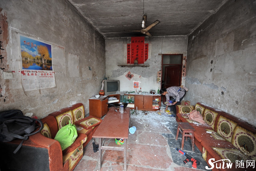 蘆山縣古城村任家崗組的任體蓮在家中打掃地震后的垃圾。她說(shuō),目前蘆山縣古城村停電,村民倉(cāng)里有谷子但打不出米來(lái),他們需要柴油機(jī)的打米機(jī),可以自己打米來(lái)自給自足,就不用外界來(lái)供應(yīng)食物了。