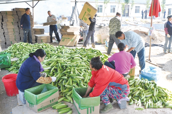 隨州網(wǎng)訊  隨州市隨縣吳山鎮(zhèn)農(nóng)壯蔬菜專業(yè)合作社反季節(jié)蔬菜秋季大豐收。每天數(shù)噸的黃瓜、茄子等新鮮蔬菜直銷河南信陽(yáng)等外地市場(chǎng)。圖為鮮菜裝箱外運(yùn)時(shí)的情景。(記者 陳德友攝)