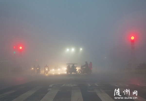 12月25日,隨州氣象臺(tái)發(fā)布大霧橙色預(yù)警,早上我市大部地區(qū)出現(xiàn)能見(jiàn)度小于200米、局部小于50米的大霧。圖為早上7點(diǎn)隨城水西門轉(zhuǎn)盤。 (記者 徐 斌攝)