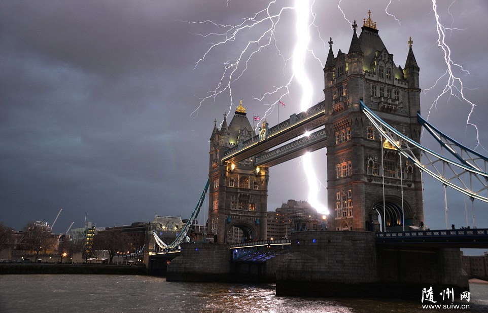 倫敦塔橋(Tower Bridge)被閃電擊中的震撼場景被抓拍下來。(網(wǎng)頁截圖)
