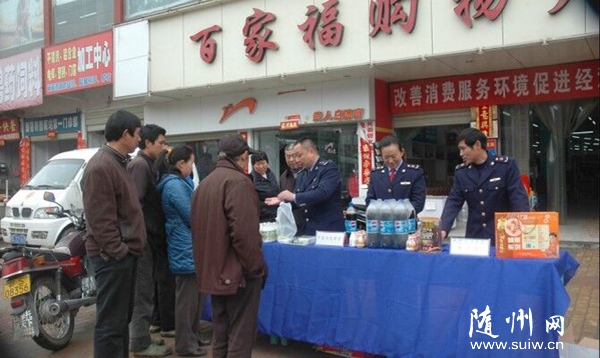 隨州網(wǎng)訊  隨州市隨縣唐縣鎮(zhèn)工商所執(zhí)法人員走上街頭,展示假冒偽劣產(chǎn)品,為群眾介紹識(shí)別假冒產(chǎn)品的常識(shí)并宣傳維權(quán)方法。(記者 周強(qiáng) 通訊員 馮波 攝)