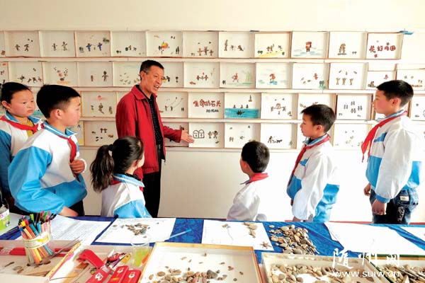 隨州網(wǎng)訊  隨州市隨縣環(huán)潭鎮(zhèn)涢水小學(xué)陽光班班主任王從倫老師指導(dǎo)學(xué)生利用大自然中的石頭和樹葉等,拼出一幅幅造型優(yōu)美、寓意深刻的石頭拼畫,激發(fā)學(xué)生的創(chuàng)意和靈感,接受美的熏陶。 (本報記者 李文軍攝)