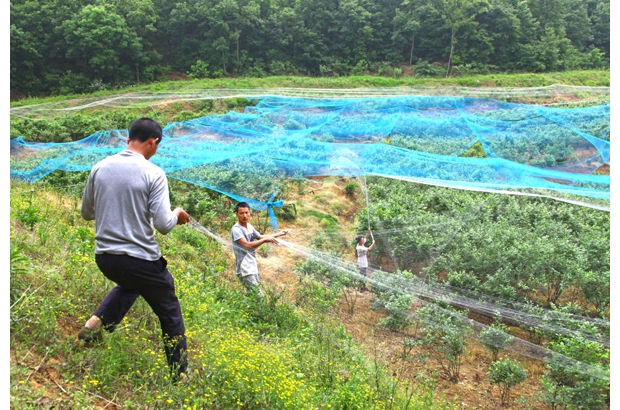 隨州網(wǎng)訊 隨州市隨縣厲山鎮(zhèn)封江藍(lán)莓園的藍(lán)莓即將成熟上市,5月5日,工人們忙著架設(shè)防鳥(niǎo)網(wǎng),以保證藍(lán)莓品質(zhì)。(本報(bào)記者 王璟天 攝)