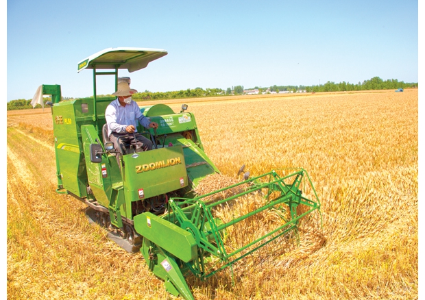 眼下正是小麥?zhǔn)崭畹募竟?jié),隨縣均川鎮(zhèn)均河村村民搶抓晴好天氣,組織收割機(jī)搶收小麥。 (記者 王璟天攝)