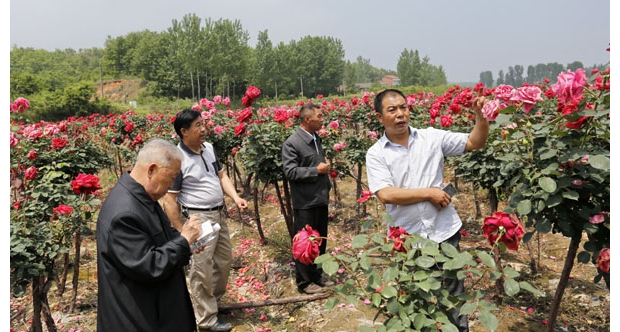 隨州網(wǎng)訊 隨州市隨縣萬和鎮(zhèn)尖峰村村民楊海國 (右)利用當(dāng)?shù)匾八N薇樹蔸同月季花嫁接成樹樁月季,為我市園林綠化提供了新品種。(記者 孫洪濤 攝)
