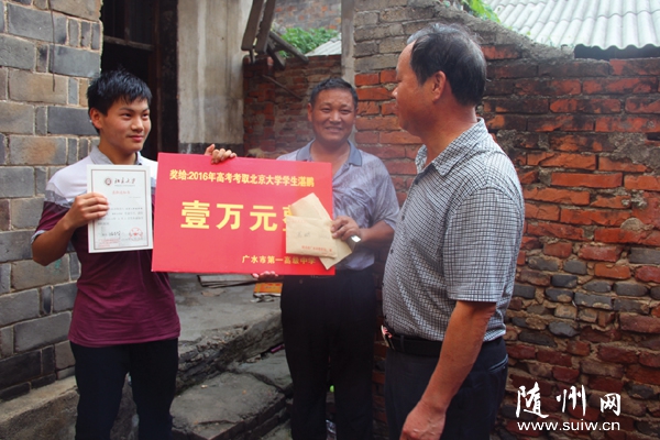隨州網(wǎng)訊  帶著對優(yōu)秀學(xué)生的祝賀,對貧困學(xué)子的關(guān)愛,8月2日,隨州廣水市教育局、廣水一中等相關(guān)負(fù)責(zé)人一行,走訪了部分優(yōu)秀貧困高考生,并為他們送去助學(xué)金,鼓勵學(xué)子們克服困難,堅定信念,學(xué)好本領(lǐng),立志成才。圖為在廣水市郝店鎮(zhèn)嚴(yán)家灣村,慰問組一行看望優(yōu)秀高中畢業(yè)生湛鵬,今年高考中他以684分的優(yōu)異成績考取北京大學(xué)。