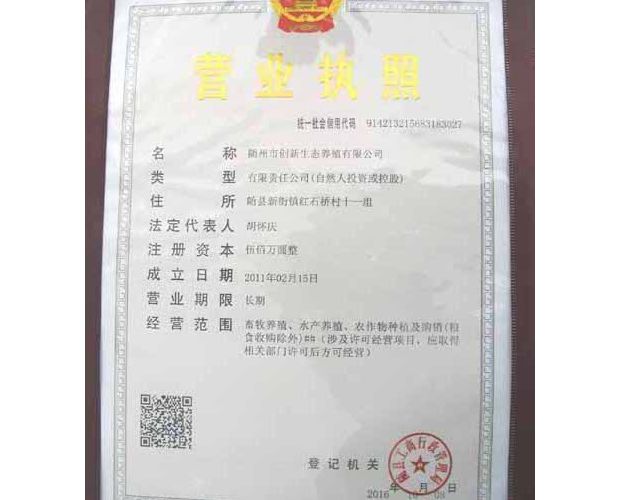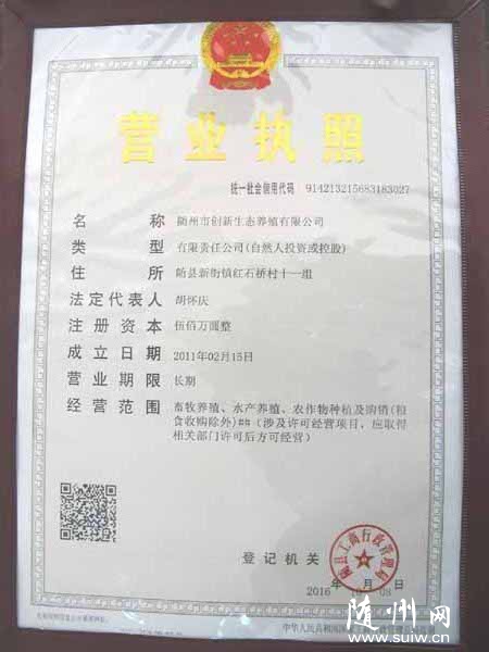 隨州網(wǎng)訊 通訊員田華、朱玲報道:10月8日,隨州市隨縣政府副縣長汪兵親臨隨縣政務服務中心,為隨州市創(chuàng)新生態(tài)養(yǎng)殖有限公司頒發(fā)了全縣首張“五證合一、一照一碼”營業(yè)執(zhí)照。