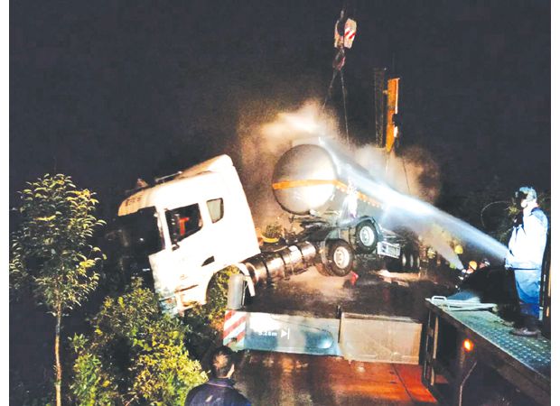 隨州網(wǎng)訊 10月27日,洪山鎮(zhèn)新陽店路段發(fā)生一起;愤\載車側翻的交通事故。接警后,隨縣交警大隊二中隊全隊民警立即趕赴現(xiàn)場處置救援。經(jīng)過近10小時的努力,危化品車所運載的環(huán)己烷被安全轉移,事故車輛也被拖運至安全地點,現(xiàn)場道路恢復通行。(通訊員 戴玉平 申騰飛攝)