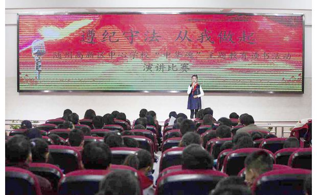 隨州網(wǎng)訊 隨州高新區(qū)學(xué)校將“中華魂”主題教育和德育教育相結(jié)合,引導(dǎo)學(xué)生從小學(xué)法、懂法、守法、遵法。圖為11月21日,隨州高新區(qū)中心學(xué)校2016年“中華魂·遵紀(jì)守法從我做起”演講比賽決賽現(xiàn)場。(本報記者 王璟天 攝)