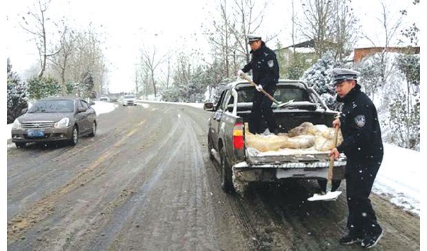 隨州網(wǎng)訊 今年入冬以來的第一場大雪如期而至,隨州市隨縣交警面對突如其來的惡劣天氣,迅速啟動應(yīng)急預(yù)案,全力投入護路行動。圖為民警在國道上進行撒鹽融冰。(通訊員 王大群攝)