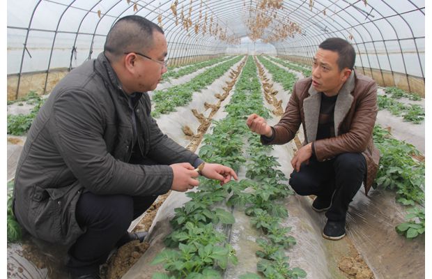 隨州網(wǎng)訊 隨州市曾都區(qū)何店鎮(zhèn)花都農(nóng)業(yè)有限公司利用35畝大棚,種植無污染地膜土豆。圖為該公司總經(jīng)理盧仁軍(右一)邀請區(qū)科協(xié)、大海菌業(yè)有限公司科技人員,就適應(yīng)大棚種植地膜土豆的溫度、濕度、病蟲害防治、采收時(shí)機(jī)、銷售、加工、儲存等,進(jìn)行技術(shù)指導(dǎo)。(通訊員 多 思攝)