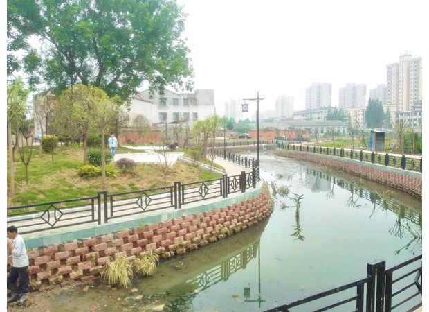 同時(shí),對(duì)渠道兩側(cè)采用生態(tài)磚固化,并栽種各種水生植物和藤蔓。在場(chǎng)地開(kāi)闊的地方,還因地制宜地打造了一個(gè)小廣場(chǎng),保護(hù)了原有的樹(shù)木,也為居民增加了一個(gè)小游園。
