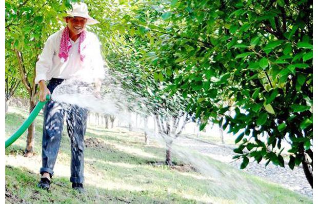 園林師傅為樹木澆水抗擊高溫