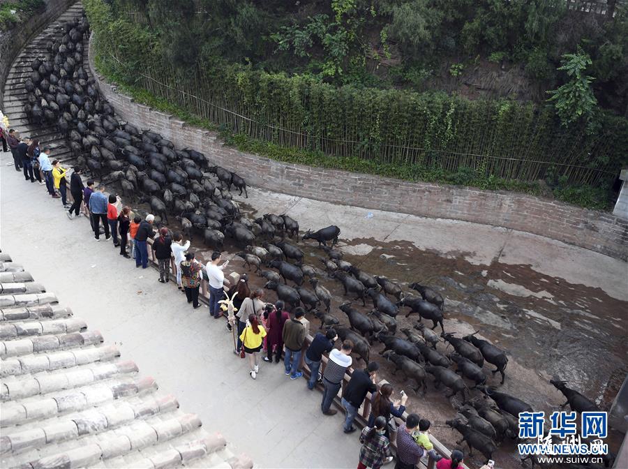 2017428日傍晚,在四川省蓬安縣相如鎮(zhèn)油房溝村,游客在觀看牛群渡江后歸欄。當(dāng)?shù)乩酶浇!叭粘龆山蠉u,日落涉水歸欄”的習(xí)慣,大力發(fā)展鄉(xiāng)村旅游,帶動(dòng)村民增收致富!