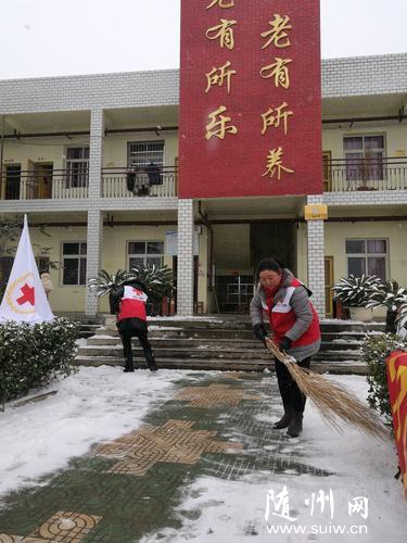 隨州網訊  1月25日,廣水市紅十字會志愿服務隊的隊員們來到應山福利院,走訪慰問孤寡老人,幫老人們收拾內務、打掃院內外積雪。 (特約記者彭曉華 通訊員程開軍攝)