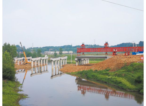 隨州網(wǎng)訊 浪河至何店一級公路全線有5座橋梁,均在快速推進(jìn)之中。圖為浪河大橋已開始吊裝箱梁,預(yù)計5月底可完成橋梁建設(shè)。 (本報記者 馮家園攝)