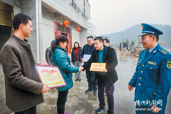 隨州新聞網(wǎng)訊 “祝賀呂國(guó)海在部隊(duì)立功!”2月26日,隨縣人武部、隨縣退役軍人事務(wù)局及三里崗鎮(zhèn)政府負(fù)責(zé)人來到三里崗鎮(zhèn)賈家灣村,給現(xiàn)役軍人呂國(guó)海的父母送去立功喜報(bào)、獎(jiǎng)牌和獎(jiǎng)勵(lì)金,將黨和政府對(duì)軍人軍屬的關(guān)心送到家門口。截至目前,隨縣已為30余名立功軍人家庭累計(jì)發(fā)放獎(jiǎng)勵(lì)金1.5萬余元。(隨州日?qǐng)?bào)全媒體記者 李文軍、通訊員 鄭程華、張良攝)