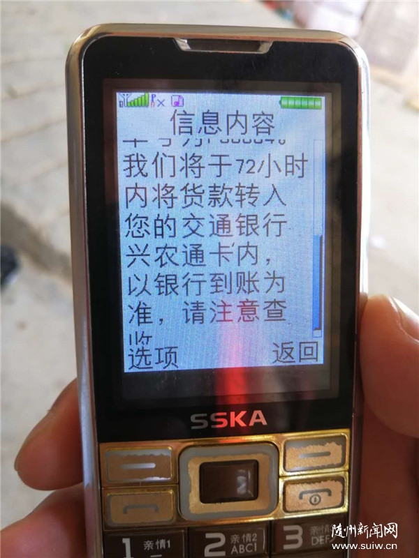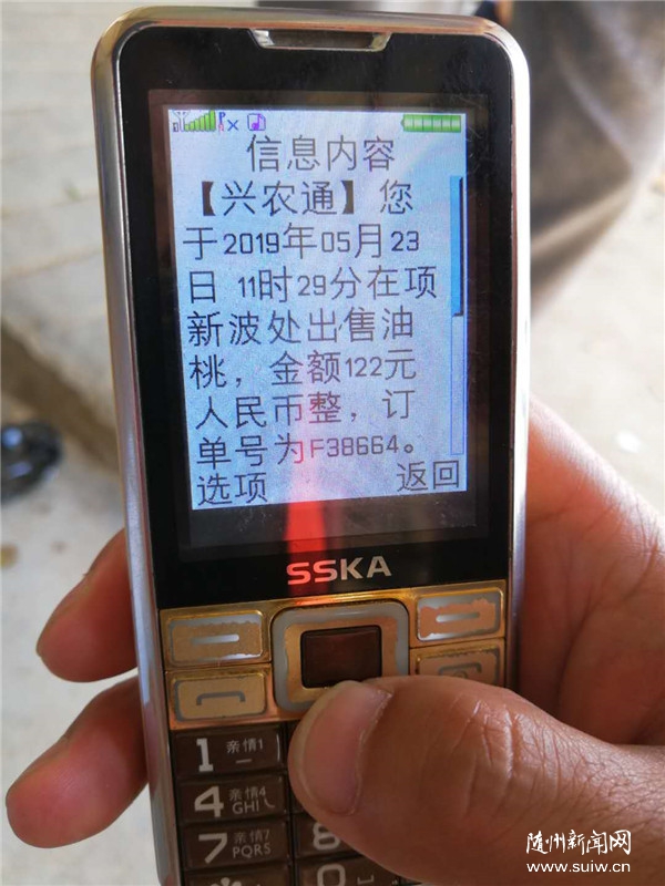 隨州日報訊 5月23日,隨縣唐縣鎮(zhèn)華寶村坤燦果品收購點,人來人往,果農劉家正拿著“興農通”卡,高興地說,賣了2200多斤油桃,4836元到賬了,太方便了。據(jù)悉,該村1萬多畝油桃從5月12日上市,現(xiàn)在正熱賣,由于天干少雨,果農擔心減產。