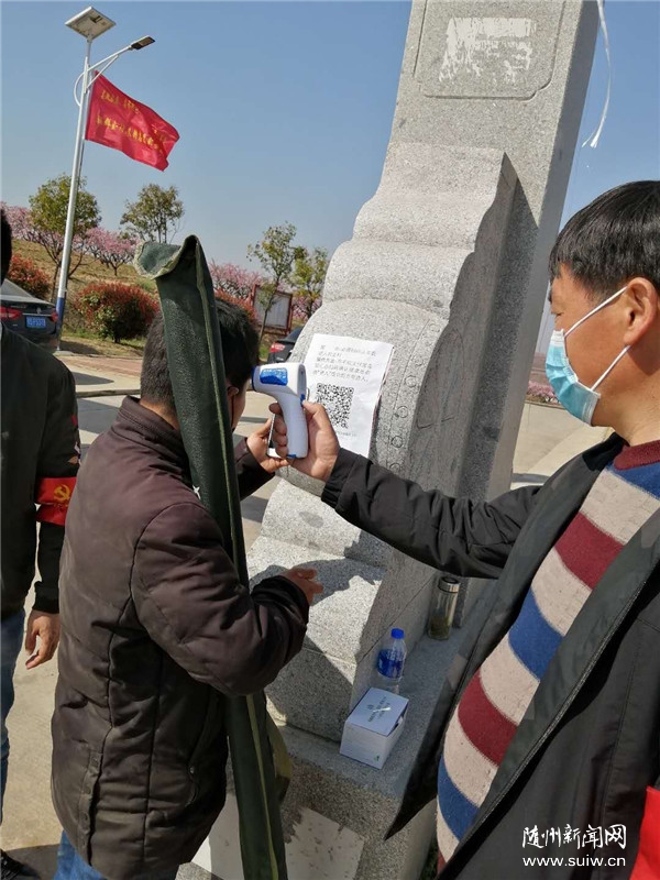 “抱歉,疫情期間不能進去賞花,請配合。”3月18日早上10點,在隨縣尚市鎮(zhèn)群金村主入口門樓處,村黨支部書記李云林不時勸返計劃前來賞桃花的游客,同時引導進出的本村村民用支付寶掃場所碼實行“一碼通行”,并現(xiàn)場測量體溫。駐村干部楊行光、徐蓬則騎車在全村巡邏,引導村民錯時下地勞作。門樓上,貼著“疫情防控期間、謝絕賞花游玩”和市縣相關(guān)疫情防控公告等。