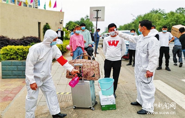 5月6日,我市高三學(xué)生復(fù)課第一天。圖為隨州實驗中學(xué)工作人員對進入校園的高三學(xué)生進行嚴(yán)格的體溫檢測和消毒。(隨州日報全媒記者李文軍攝)