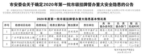 隨州市安委會關于確定2020年第一批市級掛牌督辦重大安全隱患的公告
