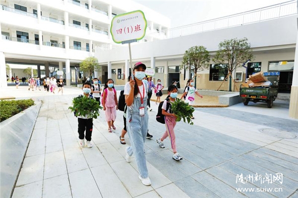 9月1日,我市中小學(xué)幼兒園正式開(kāi)學(xué),隨州23萬(wàn)余名中小學(xué)生重返校園。圖為新建的曾都區(qū)五豐學(xué)校志愿者帶著同學(xué)們走向教室。(隨州日?qǐng)?bào)全媒記者徐斌攝)