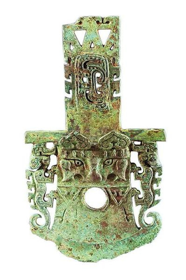 龍紋鉞,斧形,鉞援中部飾獸面紋,兩側(cè)飾圓雕龍紋。鉞是商、西周時(shí)期高等級(jí)貴族身份的象征。
