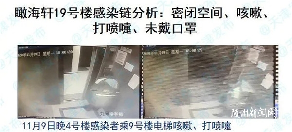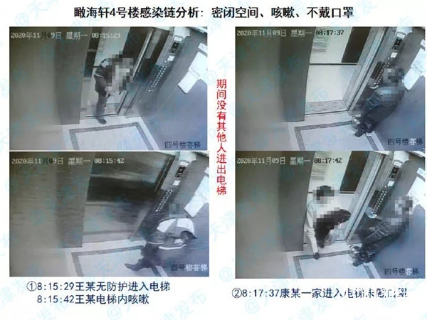 公安干警和疾控人員發(fā)現(xiàn)了線索:4號(hào)樓第一個(gè)發(fā)現(xiàn)的感染者王某,在11月9日晚去9號(hào)樓找工友。在電梯里王某不但咳嗽,還打噴嚏,沒(méi)戴口罩。11月10日,申某坐電梯去9號(hào)樓找同事,后又返回19號(hào)樓,10日下午申某住在9號(hào)樓的同事到19號(hào)樓聚餐。據(jù)檢測(cè),9號(hào)樓的電梯物表采樣新冠病毒核酸檢測(cè)陽(yáng)性,而且是多點(diǎn)位的陽(yáng)性。