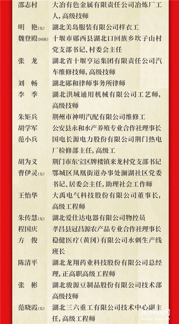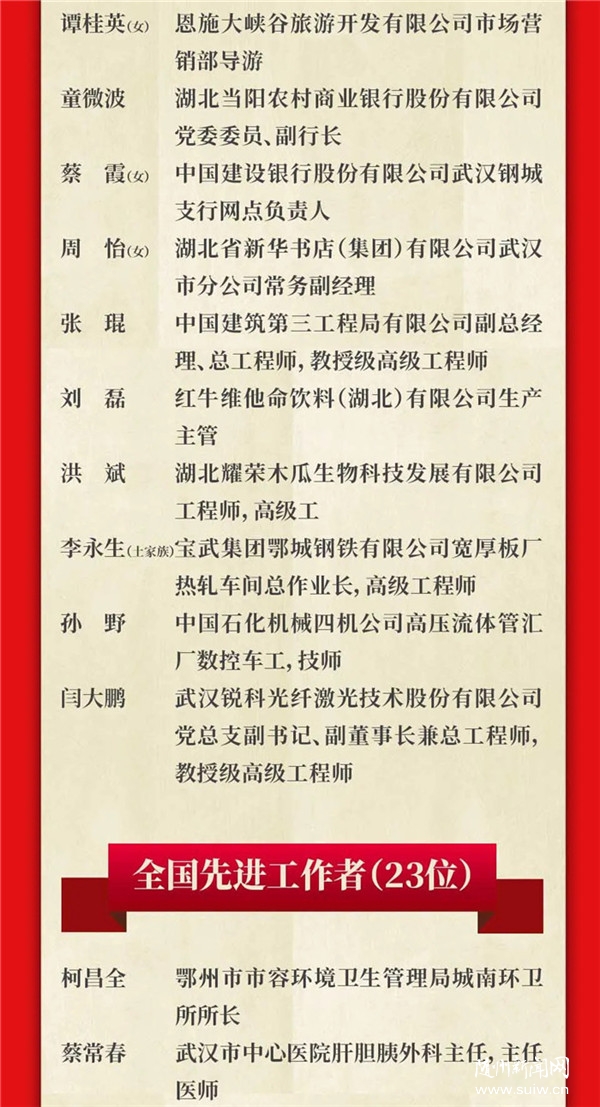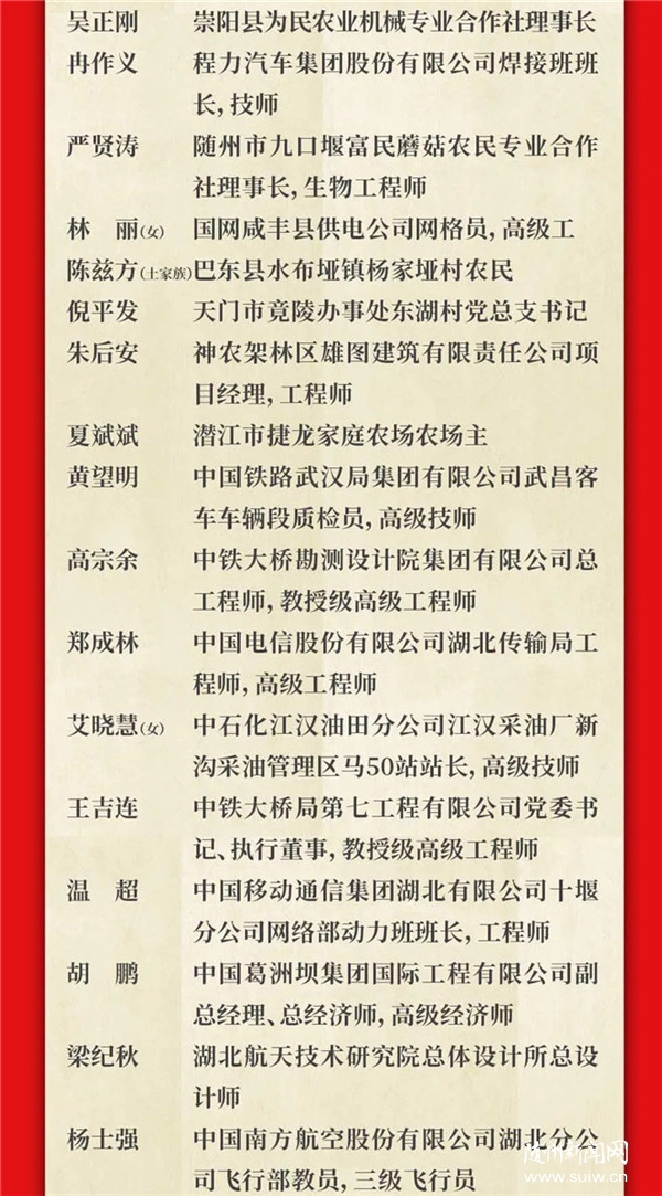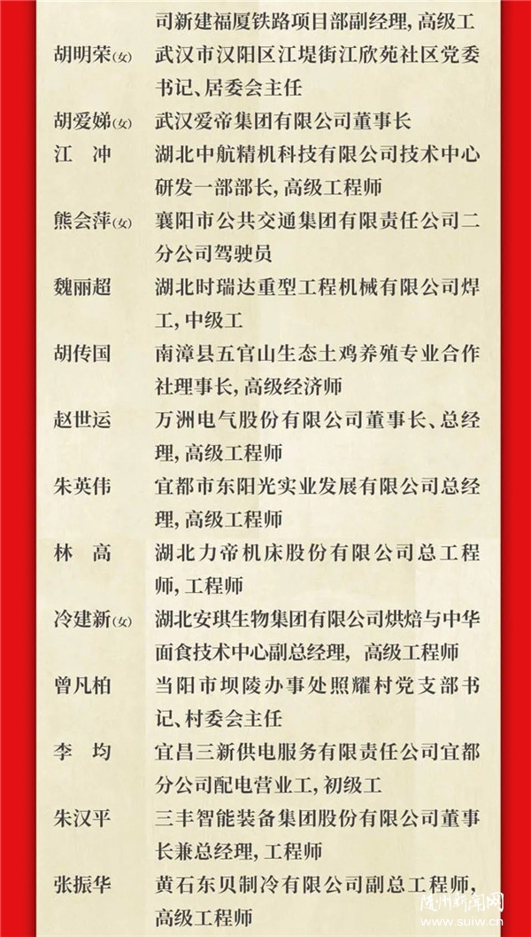 湖北省101位全國勞動模范和先進工作者接受表彰,其中,隨州2位。