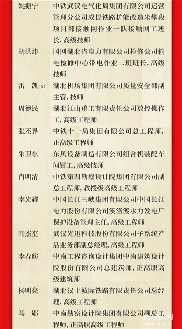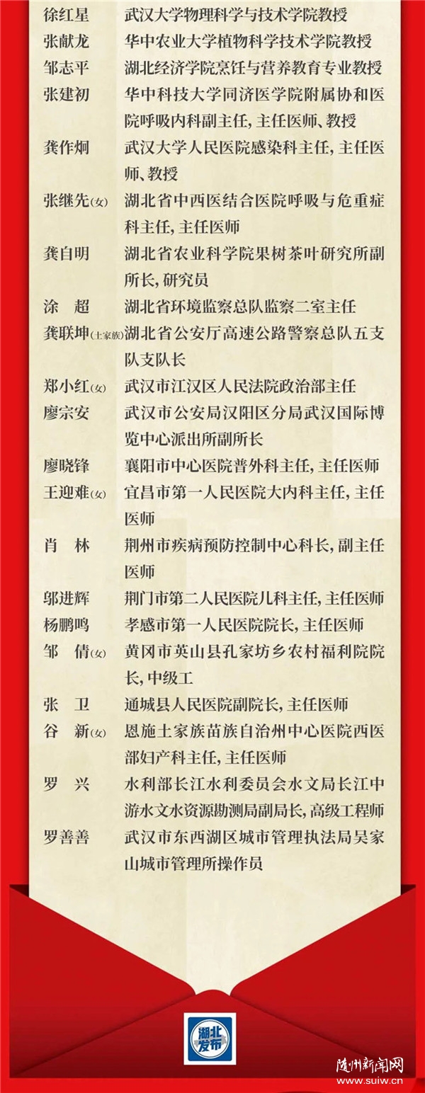 湖北省獲得表彰人員名單如下