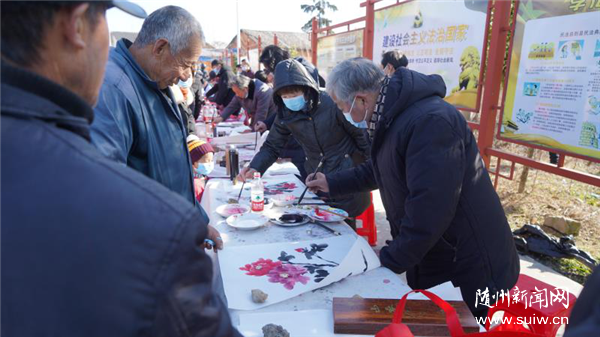 ▲書畫家為隨縣新街鎮(zhèn)水寨村的父老鄉(xiāng)親繪制“花開富貴”