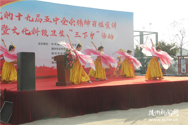 黨的十九屆五中全會(huì)精神“百姓宣講”暨文化科技衛(wèi)生“三下鄉(xiāng)”活動(dòng),由隨州市委宣傳部、隨州市文學(xué)藝術(shù)界聯(lián)合會(huì)、隨州市科學(xué)技術(shù)協(xié)會(huì)、隨州市科學(xué)技術(shù)局、隨州市衛(wèi)生健康委員會(huì)主辦,邀請(qǐng)了書法家、畫家、科技專家、醫(yī)療專家、文藝工作者等獻(xiàn)技獻(xiàn)藝,將熱熱鬧鬧的“精神集市”送到隨州各地父老鄉(xiāng)親家門口。
