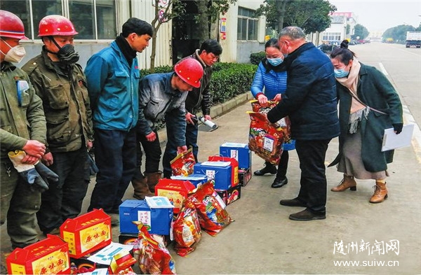 春節(jié)將至,曾都區(qū)總工會(huì)深入各企業(yè)開(kāi)展“曾都留你過(guò)大年我們給你送溫暖”活動(dòng),把黨和政府的關(guān)懷及時(shí)送達(dá)廣大職工的心坎上。圖為曾都區(qū)總工會(huì)為泰晶電子公司春節(jié)期間堅(jiān)守一線、留曾就地過(guò)年的職工送去面條、水果、糕點(diǎn)、口罩等暖心大禮包。(隨州日?qǐng)?bào)全媒記者李文軍、通訊員謝曉攝)