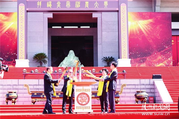6月6日,辛丑年世界華人炎帝故里尋根節(jié)開幕式暨拜祖大典上,“人民英雄”張定宇、全國脫貧攻堅楷模白晶瑩、全國優(yōu)秀共產(chǎn)黨員吳天祥、中國工程院院士范維澄共同點燃圣火。(隨州日報全媒記者李文軍攝)