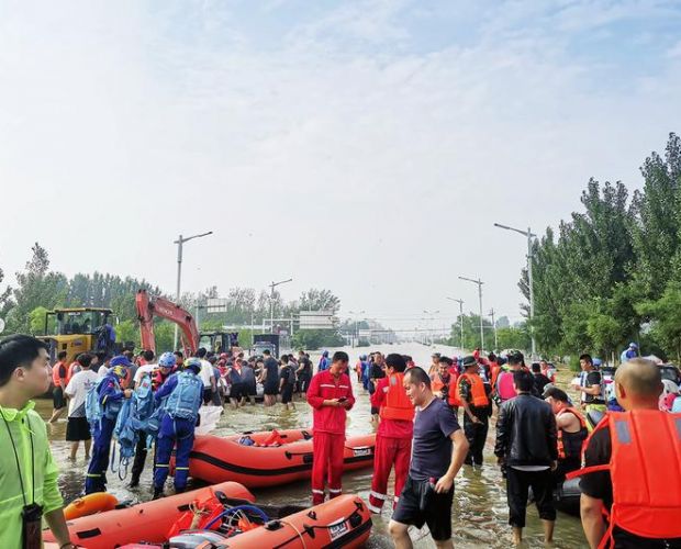 經(jīng)藍天救援隊湖北總隊審核通過,隨州藍天救援隊火速組織集結(jié)6名隊員馳援河南。圖為7月23日上午9時隨州藍天救援隊在河南省新鄉(xiāng)市開展救援。