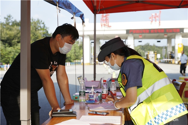 8月3日,由曾都區(qū)交通局牽頭的交通、公安、衛(wèi)健三部門組成的聯(lián)合專班,在麻竹高速隨州南出口設(shè)置值守點,對進(jìn)出高速路口的人員提供掃碼測溫等防疫服務(wù)。 (隨州日報全媒記者 徐斌攝)
