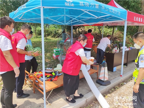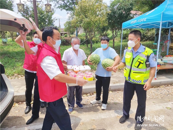 隨州日?qǐng)?bào)訊(通訊員 童小姣)“休息一下喝口果茶,再吃點(diǎn)西瓜吧!烈日灼灼,謝謝你們守衛(wèi)著我們家鄉(xiāng)的安全,辛苦了!”遞上一盤(pán)冰西瓜和果茶冷飲,看著烈日下疫情防控的警察同志和醫(yī)護(hù)人員們汗如雨下、衣服浸濕的樣子,前來(lái)“送清涼”的志愿者們深感忙碌的籌備活動(dòng)都是值得的......