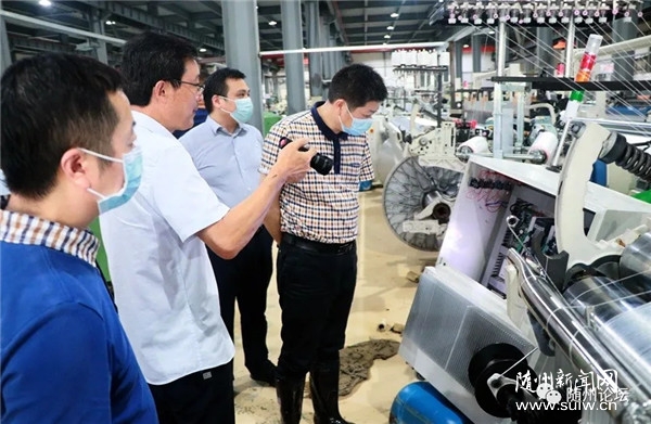 ▲人保財(cái)險湖北省省公司副總經(jīng)理 韓愛周 人保財(cái)險隨州市分公司總經(jīng)理李斌 在湖北金龍新材料股份有限公司查看因?yàn)?zāi)受損設(shè)備