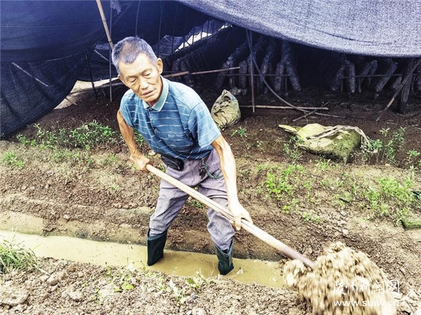 連日來,曾都區(qū)洛陽鎮(zhèn)珠寶山村村民不等不靠,抗災自救。圖為8月15日,村民楊光義正在為自家的香菇大棚清溝排水。前幾天的大水讓他家的15000袋袋料香菇受損。楊光義說,只要自己干得動,就要自立更生,減少災害帶來的損失。 (隨州日報全媒記者孫洪濤攝)