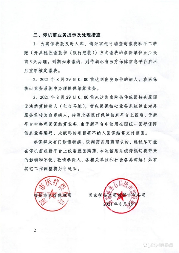 2、2021年8月26日12:00起,市稅務(wù)局、銀行暫停職工基本醫(yī)療保險費、城鄉(xiāng)居民基本醫(yī)療保險費征收業(yè)務(wù)。