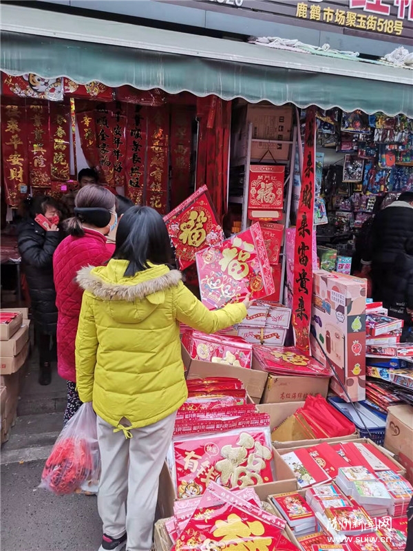 貼對聯(lián)、掛燈籠、發(fā)紅包,是中國人過年的傳統(tǒng)習(xí)俗。鹿鶴批發(fā)市場內(nèi),銷售春節(jié)飾品的商鋪擺上了對聯(lián)“!弊,掛起了燈籠,一片紅紅火火。前來購買的群眾絡(luò)繹不絕,有的在挑選稱心的對聯(lián),有的在詢問燈籠款式……市民王先生說:“貼對聯(lián)祈福納祥,掛燈籠鴻運當(dāng)頭,紅火喜慶才有年味!