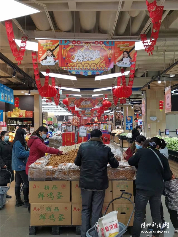 隨州日報訊(全媒記者林超)近日,記者走訪隨州城區(qū)部分街巷、市場、商超,發(fā)現(xiàn)雞鴨魚肉、果蔬蛋奶、對聯(lián)“!弊值任锲芬验_始熱銷,置辦年貨的市民臉上洋溢著笑容,濃濃的年味彌漫開來。