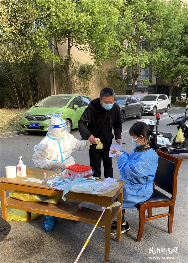 4月5日上午,全員核酸檢測緊湊有序進(jìn)行。千千水岸小區(qū),隨州日報段登攀在6個核酸采集點來回奔波,及時收集已采集試管。人民銀行章政、市科技局李蒂、隨州日報沈靖坤等隊員穿著防護(hù)服,氣溫上升后,滿頭汗水不言苦。