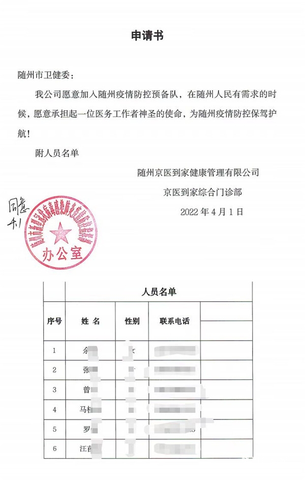 既是申請書也是“請戰(zhàn)書”。3月25日,來自北京和山東的京醫(yī)到家醫(yī)護(hù)人員來到隨州,對公司入職新員工進(jìn)行帶教和培訓(xùn)。4月1日,隨州突發(fā)疫情,尚在出差時期的8名外地醫(yī)護(hù)人員毅然決定跟隨公司一起投入到隨州抗擊疫情的隊(duì)伍中去!耙咔楫(dāng)前,隨州需要我們,我們義不容辭,這是一名醫(yī)務(wù)工作者的天職。”北京協(xié)和醫(yī)院來隨出差的醫(yī)務(wù)工作者房洪營說。