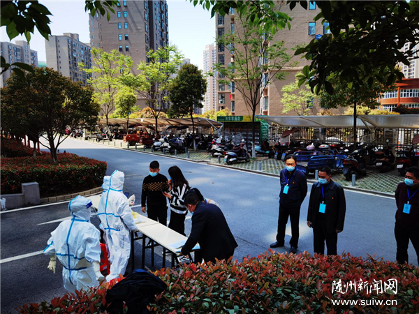 根據(jù)責(zé)任分工,大家各司其職、各盡其責(zé)。熟練地拉起警戒線,快速在地上貼上一米間隔線,布置好核酸檢測(cè)場(chǎng)地,另一組則和小區(qū)物業(yè)人員開(kāi)啟掃樓模式,挨家挨戶敲門(mén)提醒居民下樓做核酸,確保不漏一戶、不落一人。6點(diǎn)正式開(kāi)始核酸檢測(cè)。隊(duì)員們積極引導(dǎo)群眾有序排隊(duì)、協(xié)助進(jìn)行信息登記、掃碼并耐心提醒居民做好個(gè)人防護(hù)。
