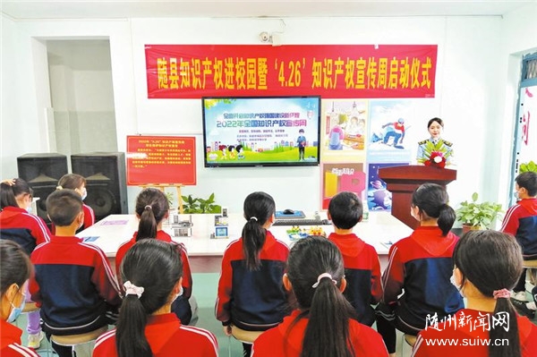4月26日,隨縣市場(chǎng)監(jiān)管局(知識(shí)產(chǎn)權(quán)局)、隨縣教育局在尚市鎮(zhèn)凈明小學(xué)舉辦知識(shí)產(chǎn)權(quán)教育進(jìn)校園活動(dòng)。凈明小學(xué)師生代表開展了保護(hù)知識(shí)產(chǎn)權(quán)宣誓和簽名活動(dòng)。圖為知識(shí)產(chǎn)權(quán)宣傳周凈明小學(xué)活動(dòng)啟動(dòng)儀式現(xiàn)場(chǎng),隨縣市場(chǎng)監(jiān)管局(知識(shí)產(chǎn)權(quán)局)專家向?qū)W生講解日常生活中的專利權(quán)、商標(biāo)權(quán)等知識(shí)產(chǎn)權(quán)基本知識(shí)。 (隨州日?qǐng)?bào)全媒記者李文軍、通訊員齊健廷、汪家望攝)