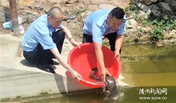 14日上午,隨縣農(nóng)業(yè)農(nóng)村局綜合執(zhí)法大隊(duì)接到熱心群眾電話,聲稱有人在隨縣吳山水庫釣到一條“四腳怪”的水生動(dòng)物。因當(dāng)時(shí)氣溫高達(dá)36度,為防止高溫引起動(dòng)物受傷,須就近現(xiàn)場(chǎng)處置。執(zhí)法人員立即跟吳山鎮(zhèn)派出所聯(lián)系,公安民警火速趕到現(xiàn)場(chǎng)。經(jīng)視頻辨認(rèn),確為一條野生娃娃魚,現(xiàn)場(chǎng)測(cè)量體長84cm,體重4.8公斤,娃娃魚活性好,游動(dòng)正常,當(dāng)即將其放生。
