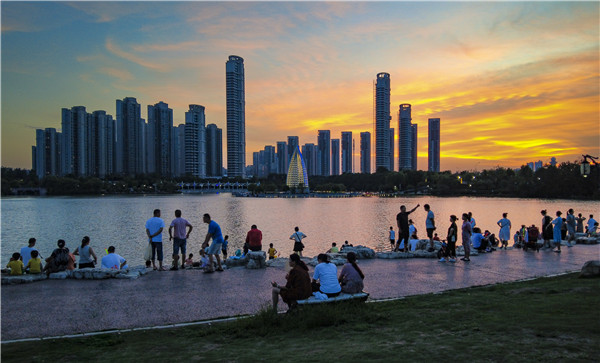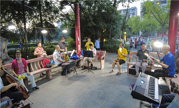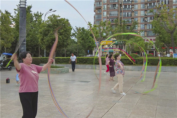 神農(nóng)公園里,小朋友們在廣場上學習跳桑巴舞、輪滑,大人們聚在一起休閑納涼、下棋、唱歌、樂器演奏,運動健身,享受美好生活。