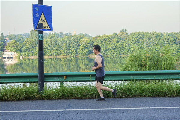 夜晚白云湖畔微風涼爽、景色宜人,人們漫步在湖邊休閑道上,邊散步,邊納涼,享受夏夜美好時光。